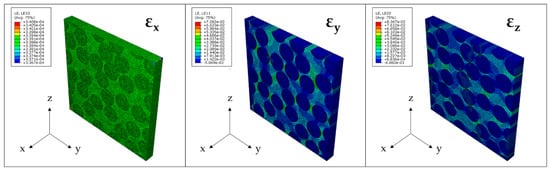 Figure 10 shows the hygrothermal strains in RVE1. For the transverse directions, and , the swelling strains arise mainly in the matrix and are negligible in the fibers, since these do not swell. For the axial direction, however, it is possible to notice a very homogeneous strain field in the whole RVE, matrix and fibers are displaced together. This observation shows the validity of the assumption in the analytical section, where axial swelling is modelled as a parallel connection of fiber and matrix.