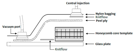 A schematic of the vacuum-assisted resin transfer molding (VARTM) process used to manufacture the hexagonal honeycombs.