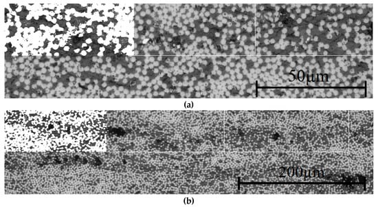 Three regions (shaded white in Figure 2) in the micrographs of images captured at magnifications of 10× and 20× were used to calculate the fiber volume fraction. Three specimens in total were sampled, and their respective volume fractions along with averages and standard deviations are listed in Table 1. From the micrographs, it is evident that the fibers are uniformly distributed within the matrix, with no trace of large resin-rich areas or inadequate compaction. Only a marginal difference (7%) between the target and measured volume fraction was observed.
