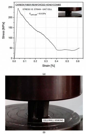 Honeycomb cores are predominantly used in sandwich panels finding applications in a variety of lightweight structures in the aerospace sector. Common aircraft structures in which honeycombs are used include fairings, spoilers, helicopter blades, galleys, flooring, wall panels, and so forth [1]. Many of these structures use aluminum and/or aramid paper–based honeycombs, due to their high strength-to-weight ratio and excellent fire, smoke, and toxicity performance. Aramid-based cores such as Nomex™ offer advantages that include a lower cost and density compared to aluminum cores. However, both cores are sensitive to moisture and exhibit structural deficiencies under prolonged moisture exposure. Therefore, to overcome these drawbacks whilst improving strength and stiffness, the search for structurally-efficient materials has led to the development of fiber-reinforced composite honeycombs. For example, Rao and co-workers [2] produced honeycomb cores that were made using short fiber–reinforced thermoplastic composites and reported a significant improvement in the mechanical and functional properties [3]. Petrone et al. [4,5] investigated the effect of short and long fiber reinforcements in the cell walls on the dynamic behavior of the core and reported substantial improvements in the load-carrying capacity when the short fibers are replaced by continuous filaments. Vivolo et al. [6] investigated the noise, vibration, and harshness (NVH) behavior of fiber-reinforced thermoplastic cores and reported improvements in transmission loss values after reinforcement. Manufacturing details of such cores, along with mechanical and functional properties, can be found in the monograph by Rao et al. [7]. Further literature focusing on a similar theme but different structures, such as the pyramidal truss or lattice and foldcore designs, based on fiber-reinforced composites is available in References [8,9,10,11,12,13]. In the continuous quest for improving properties, several researchers have sought to understand the behavior of such materials by modelling them theoretically. However, due to manufacturing difficulties, little work has been undertaken to assess the properties of honeycomb structures manufactured using carbon fiber epoxy composites. One notable work is that by Russell et al. [14], who manufactured and conducted experiments and numerical analyses on carbon fiber epoxy composite cores based on a square geometry. The manufacturing technique involved slotting rectangular sheets together, assembling them into a square honeycomb configuration, and adhesively bonding the composite laminate sheets. The authors showed that the compressive strength of such structures is strongly dependent on the fiber orientation and laminate type. They also noted that the composite honeycombs failed by either elastic buckling or plastic micro-buckling when loaded in compression.