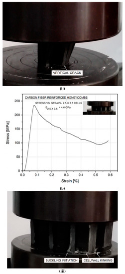 Stress vs. strain traces of fiber-reinforced honeycombs used to calculate elastic modulus of (a) unit cell and (b) cores based on 2.5 × 3.5 cells. (i) Unit cell cell-wall kinking at supports, (ii) vertical cracks developed at supports, (iii) cell wall buckling initiation and kinking of 2.5 × 3.5 cell core (iv), and core failure due to buckling-initiated cell wall rupture.