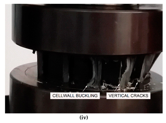 Failure instability initiates at 0.02% strain due to cell wall kinking (Figure 3(i,iii)) at the bottom support at a compressive stress of approximately 185 MPa in the single unit cell and 175 MPa in the 2.5 × 3.5 cells. The cell walls then buckle at approximately 225 MPa for the case of the unit cell and 200 MPa for the 2.5 × 3.5 cell samples. Vertical cracks start to develop at the junction of the inclined and the vertical cell walls shortly afterwards (indicated by the white arrows in Figure 3(ii,iv)), followed by the progressive collapsing of the cell wall after the peak compressive stress.