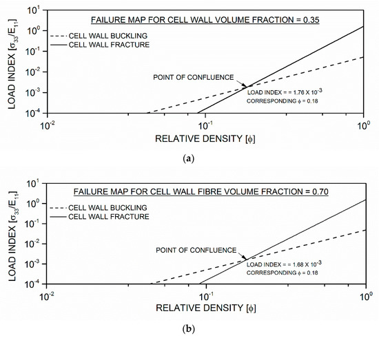 Since a linear buckling analysis is adopted here, the failure maps (Figure 4) developed in the Matlab environment were created for the two fiber volume fractions (0.35 and 0.7), assuming linearity. The plot shows the maximum load-carrying capacity as a function of relative density, based on specially-orthotropic material. The load index on the y-axis in the maps was normalized by the Young’s modulus, E11, of the respective cell wall fiber volume fractions. At lower relative densities (0.04–0.09), compressive buckling of cell walls appeared to be the dominating mode of failure which transitioned briefly to cell wall fracture between relative densities of 0.09 and 0.18. The point of confluence in Figure 4 is obtained by equating σz(fracture) and σz(buckling) and eliminating . The density at that point is the balanced relative density that indicates the occurrence of both buckling and fracture simultaneously and represents the optimum relative density for the core. With any further increase in relative density beyond this point, the dominant failure mode changes from cell wall fracture to buckling. The load indices at the point of confluence for cores with cell wall fiber volume fractions of 0.35 and 0.7 are 1.76 × 10−3 and 1.68 × 10−3, respectively. The corresponding compressive stresses are 147 MPa and 272 MPa, and the relative density at that point is 0.23 for both fiber volume fractions. Compared with the experimental results, for the core of relative density 0.15, the failure mode (buckling) is in clear agreement with analytical predictions in Figure 3(i,ii).