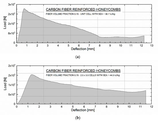 Figure 5 shows the load-displacement responses and the computed specific energy absorption values of the unit cell and 2.5 × 3.5 cell samples subjected to quasi-static axial crushing. The crushing process of the unit cell and 2.5 × 3.5 cell honeycomb structures is shown in Figure 3. For both the unit cell and the array, the structure exhibits an initial linear response before reaching peak loads of approximately 26 and 150 kN, respectively. After the critical compressive peak load, a large drop in the crushing load was observed due to cell wall collapse through bending and local buckling. Based on the test results, the 2.5 × 3.5 cells exhibit specific energy absorption values of 44.5 and 36.7 kJ/kg, respectively. From the images in the insert of Figure 3a, the unconstrained cell walls in the single unit cell appear to be free to slide during the crushing process, indicating an unstable and less efficient energy absorption mode. However, as the number of cells increases (2.5 × 3.5), the cell walls within the periphery of the specimen appear to collapse more progressively, due to the change in the restraint conditions, which in effect contributes to a higher energy absorption.
