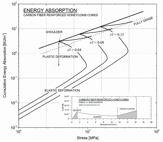 It is evident that the total energy absorption increases with increasing cell wall t/l ratio, with higher absorption occurring in the elastic region, followed by the plastic region, and then the densification region. Optimal energy absorption is given by the curve linking the inflection points of all of the t/l traces in the diagram, denoted as a bold black line in Figure 7. These diagrams can be used to characterize the cushioning properties of the cores and hence to optimize their structures.