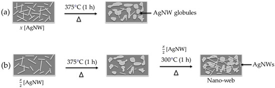 (a) Single-stage and (b) two-stage silver nanowire deposition. [AgNW] represents the concentration of nanowires deposited at each stage.