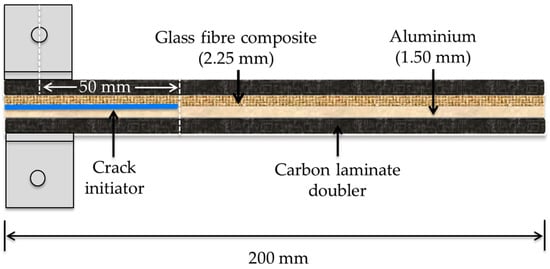 The mode I fracture toughness properties of the FML composites were evaluated using the DCB specimens in accordance with the ASTM Standard D5528. To preclude the breakage of test specimens during loading due to potentially enhanced fracture toughness, 16-ply unidirectional carbon fibre-epoxy (VTM264) composite laminates were bonded onto the DCB specimens using Araldite 420, an epoxy-based adhesive supplied by Huntsman®. A schematic of the DCB specimen showing the geometry and dimensions is shown in Figure 2.