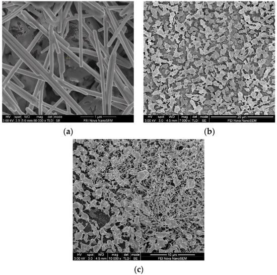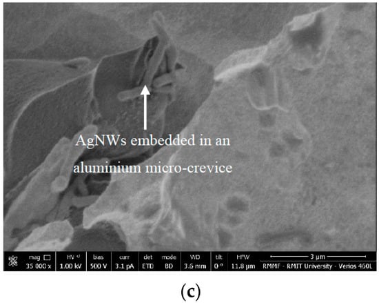 SEM images of AgNW-modified aluminium surfaces showing nanowires (a) bonded (metallic) to aluminium and (b) to each other and (c) embedded in aluminium micro-crevices.