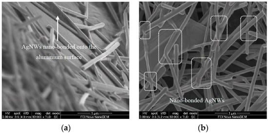 As revealed by the close-up SEM images of the nano-modified aluminium surfaces in Figure 4, metallic bonding was created between AgNWs and aluminium substrate as a result of the nano-bonding procedure. Figure 4c shows AgNWs anchored within micro-sized crevices on the aluminium surface. In instances where the AgNWs were oriented normal to the aluminium sheet, they were expected to contribute to improved metal–FRP laminate fracture toughness as demonstrated by Nguyen and others [,] for hybrid metal-composite joints with integrated 3D-printed metallic reinforcements. Figure 4a provides evidence for metallic bonding of AgNWs along their axial lengths to the aluminium substrate. The AgNWs oriented along the aluminium surface may contribute towards improved fracture toughness via strain energy dissipated as they peel-off the metal surface during the crack propagation phase. Pressure-less metal-metal bonding of the AgNWs is evident from the SEM image shown in Figure 4b. The presence of a silver nano-web at the metal–FRP laminate interface has the potential to slow down delamination crack growth via a suite of toughening mechanisms that may include crack arrest, crack deflection, matrix crack-bridging, plastic deformation and fracture of the nano-web as well as surface peel-off.