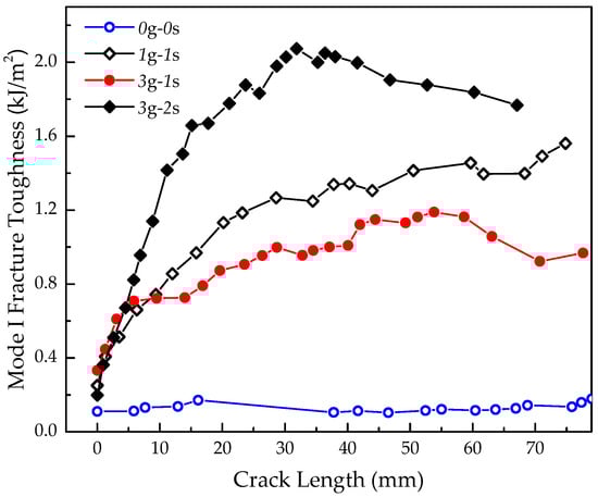 The effect of aluminium surface modification (i.e., AgNW concentration and/or deposition process) on the mode I crack growth resistance (R) curve at the metal–laminate interface is shown in Figure 5. The baseline FML composite (without AgNWs) yielded an R-curve exhibiting relatively low and unchanging fracture toughness with increasing crack length. In contrast, the R-curves for nano-reinforced FMLs revealed gradual increases in the fracture toughness within the initial crack growth phases (0–40 mm crack length) and reached steady-state fracture toughness values at crack length values above 40 mm.