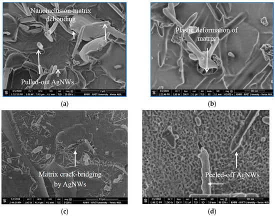 The triaxial stresses operating ahead of the crack tip caused interfacial debonding due to the mismatch in the epoxy matrix and AgNW stiffness as evident in Figure 7a. It is inevitable that some of the AgNWs aligned along or at an angle to the Z-direction extended into the delamination crack path at the metal-glass/epoxy laminate interface. Thus, behind the crack tip, the debonded AgNWs bridged the crack faces and gradually pulled-out of the matrix as the COD increased (Figure 7a). The traction loads generated by the AgNWs as they pull-out of the matrix reduced triaxial stresses exerted at or ahead of the crack tip thereby effectively increasing the steady-state fracture toughness.