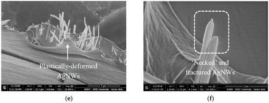 SEM images showing (a) debonded and pulled-out AgNWs, (b) plastically deformed epoxy matrix, (c) matrix crack-bridging by AgNWs, (d) aluminium-surface imprints left behind after AgNWs peeled off, (e) plastically deformed (i.e., straightened) AgNWs and (f) fractured AgNWs revealing localized plastic deformation (i.e., ‘necking’).