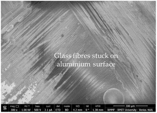 SEM image showing the glass fibres that remained bonded to the aluminium adherend following delamination fracture.