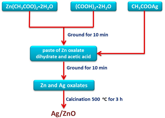 Ag/ZnO was prepared by the mechanochemical combustion technique with controlled combustion method (Figure 1). In a typical synthesis, 2.195 g of zinc acetate dihydrate and 2.521 g of oxalic acid dihydrate were taken in agate mortar and the mixture was ground for 10 min in order to obtain a paste of zinc oxalate dihydrate and acetic acid. The existence of acetic acid was confirmed by its typical smell. The loss of acetic acid byproduct in the form of fumes became a driving force for the reaction. Silver acetate was added to the above paste as a source of silver, and the grinding process was continued for the next 10 min to obtain zinc oxalate-silver oxalate precursor. The Ag doped zinc oxide crystallites were obtained by calcination of precursor powders at the temperature of 300−700 °C under an air atmosphere. The undoped ZnO was also synthesized by calcination of a paste of zinc oxalate and acetic acid for the comparison.