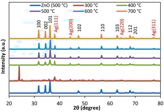 Figure 2 displays XRD analysis of Ag/ZnO nanocomposites synthesized at calcination temperatures from 300 °C to 700 °C. The major peaks of ZnO at 2θ values of 31.7°, 34.4°, 36.2° and 47.5° can be indexed to (100), (002), (101) and (102) crystal planes and characteristic ZnO peaks become obvious at calcination temperatures above 300 °C. It should be noted that the formation of the crystalline phase of ZnO begins at about 400 °C [20]. From Figure 2, it can be seen that Ag/ZnO composite samples has four major peaks at 38.16°, 44.34°, 64.48° and 77.42°, which are readily assigned to the (111), (200), (220) and (311) planes of face–center–cubic (fcc) structure of Ag (JCPDS card no. 04–783), respectively [21].