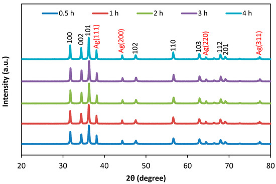 The Figure 3 illustrates XRD analysis of Ag/ZnO at different calcination times from 0.5 h to 4 h. The diffraction intensities and angles of ZnO and Ag does not remarkably shift with increasing calcination time.