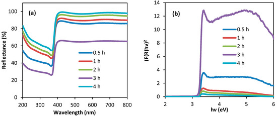 (a) Diffuse reflectance UV–visible spectra of Ag/ZnO and (b) Tauc plot of [F(R)hν]2 versus photon energy at different calcination times.