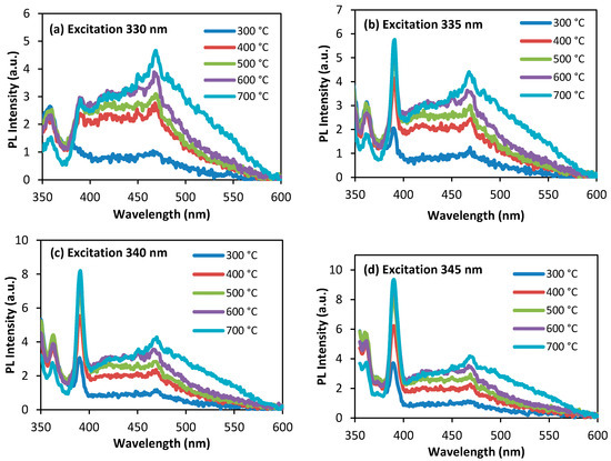 The room temperature photoluminescence (PL) spectra of Ag/ZnO are recorded over the wavelength range 350−600 nm. Figure 7 present the PL of Ag/ZnO synthesized at different calcination temperatures. In the PL spectra for ZnO, typically there are emission bands in the ultraviolet (UV) and visible (green, yellow, blue and violet) regions [28]. The Ag/ZnO composite shows a strong emission peak at around 389 nm in the UV region, which is attributed to near band edge emission and also related to the electron–hole charge recombination process [29]. The weak emission at 400–600 nm corresponds to intrinsic or extrinsic defects in ZnO and oxygen vacancies. It is estimated that the blue band emission is due to the transition from extended interstitial Zn states to the valence band [30]. The peak position of the blue emissions is almost the same for the samples obtained at 300–700 °C calcination temperatures and the usual band edge emission is not obtained at the high excitation energy (330 nm) for Ag/ZnO (Figure 7a). The band edge and blue band emissions are observed for the use of low excitation energy at 335–345 nm, as presented in Figure 7b–d. The near band edge is weak at 330 nm excitation due to low the exciton recombination and strong near band edge is observed on excitation at 340 nm due to the high exciton transition from the localized level below the conduction band to the valence band.