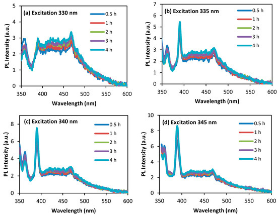 Figure 8 present the PL of Ag/ZnO synthesized at different calcination times. The peak positions of the blue emissions are almost the same for the composites obtained for calcination times (Figure 8). The usual band edge emission in the UV region cannot be obtained at 330 nm excitation (Figure 8a). At excitation energies of 335–345 nm, the usual band edge and deep-level emission in the blue band can be seen, as shown in Figure 8b–d.