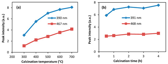 Changes of relative intensity with (a) different calcination temperatures and (b) different calcination times.