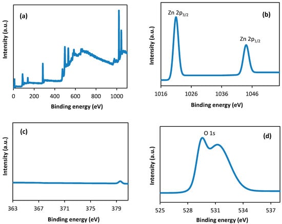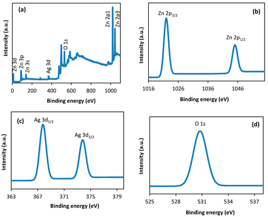 XPS is a sensitive technique for investigating the chemical composition of the surface of a material. The surface compositions and chemical states of the pure ZnO are determined by XPS. Figure 10a displays the fully scanned spectrum of ZnO synthesized at a calcination temperature of 500 °C for 3 h. In Figure 10b, the peak of Zn 2p1/2 and Zn 2p3/2 is located at 1044.1 and 1021.0 eV, respectively [31]. At 373.6 eV (Ag 3d3/2) and 367.6 eV (Ag 3d5/2), the peaks are not detected in undoped ZnO (Figure 10c) [32]. The O1s spectra of ZnO are shown in Figure 10d. The 529.6 eV peak belongs to the crystal lattice oxygen (OL) in ZnO, while the 531.2 eV peak can be assigned to the oxygen of surface hydroxyl (OH) on the catalyst surface [33].