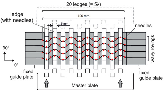 The sliding mechanism consists of 20 ledges, which are 5 mm wide and feature a needle every 5 mm. Galvanized fine wire staples with a diameter of mm, glued into an aluminum strip, are used for the needles. The fabric is applied on top of the needles and pushed downwards so that the needles penetrate the fabric. Then, the ledges are pushed simultaneously into opposite directions by master plates which define the amplitude of the wave. The two-step preforming process consists of a first forming and activation step for each individual ply of the stack, and a second stacking and activation step to form the whole six-ply laminate. In the first step, the wavy pattern is fixed by activating the binder with a hot air gun when the fabric is still attached to the needle strips. This process step takes place without compression. After careful removal from the tool, the waves remain in the preform. In the second step, all plies are accurately stacked upon each other and joined in a membrane press by activating the binder for the second time. The forces in the membrane press are created by a vacuum and do not exceed a pressure of . Movements of the fibers within the flat preform can, thus, be excluded.
