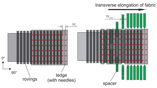 Sliding mechanism with needle ledges to induce gaps between the roving bundles (black—roving, grey—ledge with needles (red), dark grey—spacer ). (Left): undeformed state; (Right): spacers are inserted between the needle ledges.