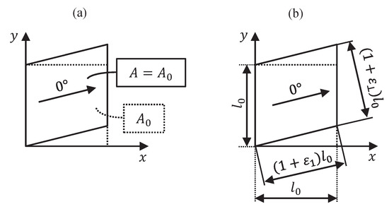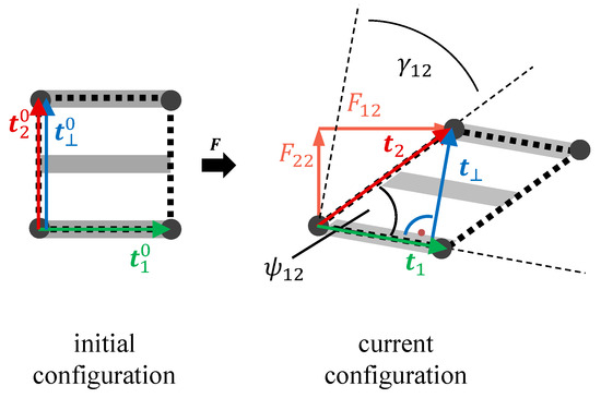 The initial undeformed configuration is defined by line segments and , which both correspond to the principal directions of the material (see Figure 4). After deformation, the line segments are expressed in the current configuration by