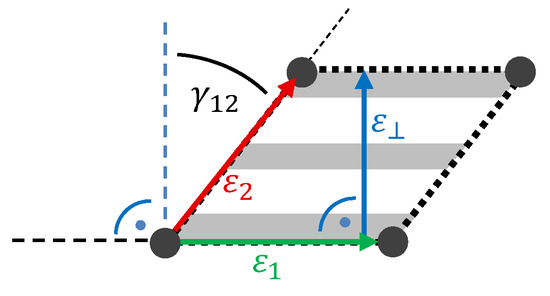 If both equations are inserted into the formulation of the perpendicular strain (Equation (4)), the interrelation between the strain components , and becomes obvious: