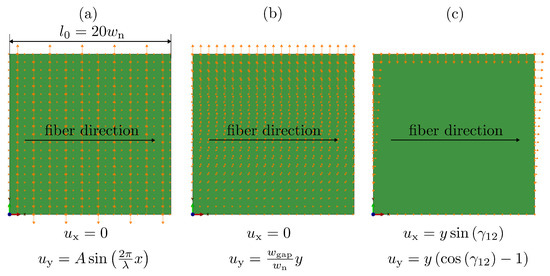 where A defines the amplitude, the wave length and x the node coordinate along the fiber direction (cf. Figure 7a). All other displacements are fixed (). Comparable to the wavy pattern, gapping is created by using displacement boundary conditions at each node at intervals of