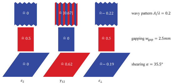 Using the previously defined simulation setup, each configuration is evaluated regarding the resulting FVC. For all simulation results, the perpendicular strain is unequal to zero (cf. Figure 9). Besides perpendicular strain, the fiber gapping and shearing create only one active strain component ( for fiber gapping and for shearing). On the other hand, the wavy pattern creates a simple shear load case where the shear strain is unequal to zero. Additionally, large strains in fiber direction arise. This high strain, however, does not represent the actual material behavior, but is solely caused by the applied boundary conditions to reproduce the sliding of the fibers through the yarn. Therefore, the change of the area is calculated via Equation (26) rather than (24).