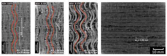 During deformation, a spring back effect in the wavy section of was observed for ratios above 0.05. Therefore, the applied amplitude had to be increased to achieve the specified amplitude. If the total length of the preform has to be increased, e.g., to manufacture tensile specimens (total length of specimen 250 mm according to DIN EN ISO 527-5), more fibers have to slide through the undeformed area, especially for larger ratios, which increases the friction during forming. To achieve reproducible results for , it is recommended to reduce the wavy section of the preform to , if the total length of the preform exceeds 200 mm. The areal weight values given in Table 2 are the average value of five samples weighed together.