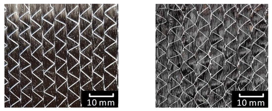 When creating gaps, the polyester stitching yarn with its right-left tricot pattern is primarily responsible for the deformation behavior of the fabric. The seams of the stitching yarn run in fiber direction and the upper thread forms the zigzag pattern. Gaps are created by moving the roving bundles perpendicular to their longitudinal direction. Thus, the sharp angle of the zigzag pattern becomes even sharper (see Figure 12). With an increasing gapping distance, the roving bundles become wider—as they are fixed between the seams of the stitching yarn—and are forced into an in-plane waviness due to the sharpening angles of the zigzag pattern. These effects become more visible above 2 mm gap size as the CT scan in Figure 11 (right) shows, where waves occur due to the deformed stitching yarn.