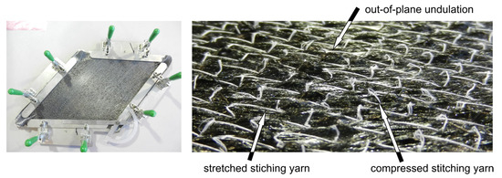 Shear frame with sheared UD-NCF at (left) and deformation of the stitching yarn with out-of-plane fiber undulation (right).