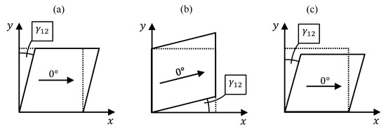For arbitrary shear strain and physically plausible deformations, the right-hand side of Equation (28) remains always positive, . Therefore, the strain components and must have the same algebraic sign and is smaller than . Only in cases where or are equal to zero, the algebraic sign may change