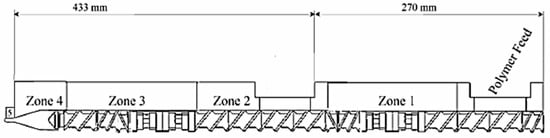 Eucalyptus bark was milled in a Wiley-type mill to a particle size of 18 mesh and blended with polypropylene (PP) at a ratio of 1:1, 2% MAPP. Composites were prepared in a twin-screw extruder, L:D 36 (Coperion model ZSK-25, Stuttgart, Germany). In order to prevent PP degradation and provide the fusion between fiber and polymer, the processing conditions in the extruder were 180 rpm and the temperature profile of 190, 190, 180, and 180 °C at the four heating zones and 160 °C at the dye. After that, the material was chopped into granules (SAGEC brand, model GS mill 70). The next step was to inject the composite granules into an injection-molding machine (Sandretto Model 65/247) for sampling preparation for mechanical tests. Both fibers and granules were previously dried at 105 °C for the production of the composites. The parallel screws are modular, along the barrel length with screw shaft sections that can be changed depending on the objectives (conveying, dispersive mixing, distributive mixing, etc.). The design used is showed in Figure 1. The feeding process was the one in which both components are introduced at the same time to avoid overheating.