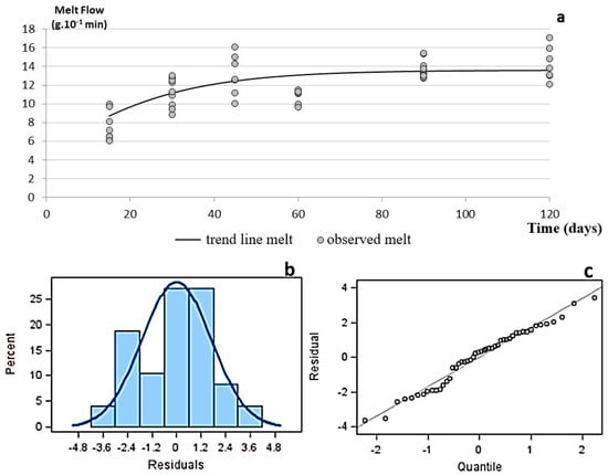 Nonlinear monomolecular growth fitted model for P. sanguineous melt flow (g·10−1 min) in time (d) (a) . The coefficient of determination is defined as the square of the correlation coefficient between observed and fitted values by the model [38]. The residual analysis and quantile are in (b,c), respectively, with the test of normality by Kolmogorov–Smirnov (p > 0.15).