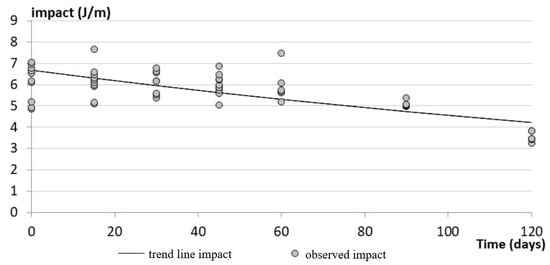 The impact strength of the biodegraded and non-biodegraded samples did not show a statistical difference at 5% probability (p = 0.1647). However, under the impact parameter for the biological treatment, an effect with time occurred (Figure 3) and an exponential regression equation could be adjusted: , with p < 0.0001 for the estimation of parameters.