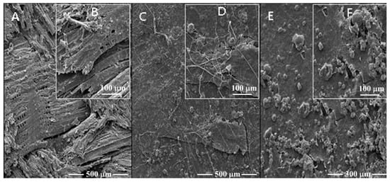 Micrographs of wood-plastic composites (WPCs) after non-biological treatment (A,B) and colonized by P. sanguineus for 60 days (C,D) and 120 days (E,F). Micrographs A, C, and E are 500× zoom, while B, D, and F are 1000× zoom.