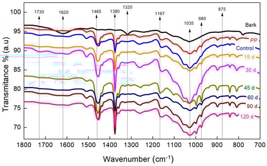 In general, the fungus did not cause serious chemical changes in the WPCs. The most modifications occurred in the 30 and 45 d samples. Specifically, the spectra of the 30 d samples showed prominent changes at 1035 cm−1, related to C-O and C-C-O stretching of lignin and carbohydrates. Only in this treatment were shoulders observed at 1595 and 1730 cm−1, which are related to the aromatic ring vibration of lignin and ketone C=O stretching of hemicellulose, respectively (Figure 6).