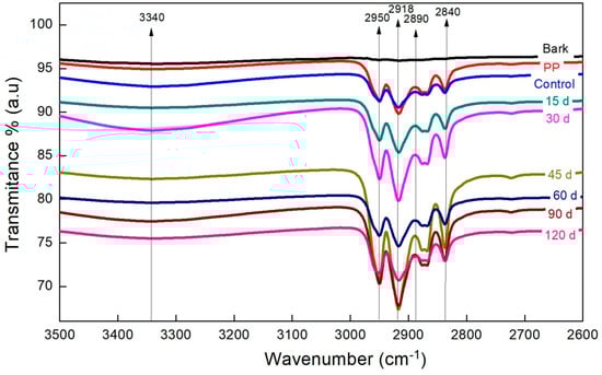 The spectra from 45-day samples showed more visible peaks in the range of 842 to 1000 cm−1, which are related to the glycosidic linkage of hemicellulose and the C-O vibration of cellulose. The peak at 1167 cm−1 is related to the C-O-C linkages of cellulose and hemicellulose and the peak at 1380 cm−1 is related to the C-H bending of all three major components of the wood, while 1363 cm−1 is related to CH deformation (symmetric). The peak at 1465 cm−1 is related to C-H deformation in lignin and carbohydrates [66,67,68]. Compared to the PP samples with the same treatment, modifications of the peaks at 808, 842, and 980 cm−1 are observed, which are related to C-H out-of-plane deformation [69]. These peaks are absent in the control treatment, but they reappear in the spectra of the 120 day samples. This can be related to the exposure of PP after lignocellulosic biodegradation, which again exposed these C-H deformations in the range of 975 to 998 cm−1 (Figure 7).