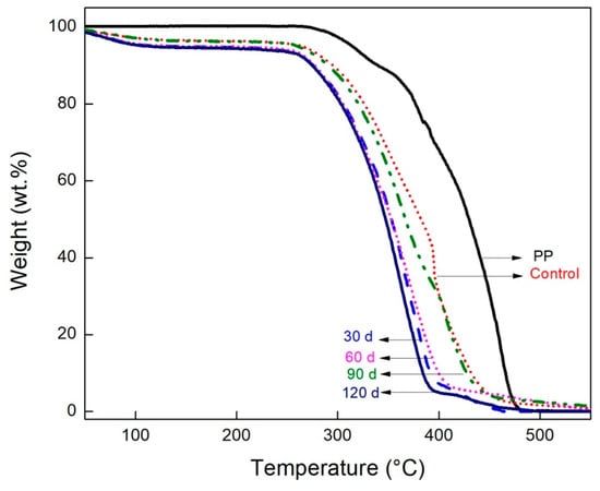 Thermogravimetric analysis (TGA) curves of PP, control sample (WPC non-biological treatment) and WPCs colonized by P. sanguineus for 30, 60, 90, and 120 days.