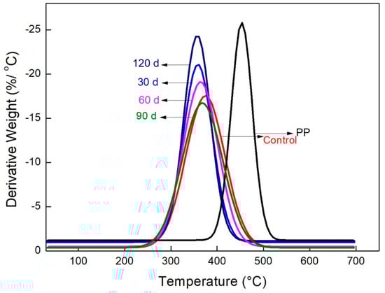 Derivative thermogravimetric (DTG) curves of PP, control sample (WPC non-biological treatment) and WPCs colonized by P. sanguineus for 30, 60, 90, and 120 days.