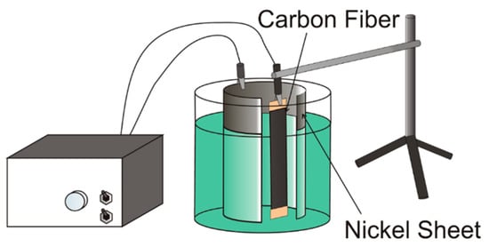 The CNT deposition on the surface of carbon fibre was carried out in Chemical Vapor Deposition by a CVD apparatus (MPCVD-70, Microphase Co., Ltd., Tsukuba, Japan) as shown in Figure 1. Ethanol was used as the carbon source. Ni was plated as the catalyst on the surface of carbon fibre by electro Ni plating with the current of 0.3 A and the plating time of 15 s as shown in Figure 2. The Ni plating bath (watt bath) consists of 240 g/L of Nickel sulphate hexahydrate (NiSO4·6H2O), 45 g/L of Nickel chloride hexahydrate (NiCl2·6H2O) and 30 g/L of Boracic acid (H3BO3). The deposition conditions of CNT were under vacuum at 600 °C for 10 min, 30 min and 60 min. CNT grafted carbon fibres with deposition times of 10 min, 30 min and 60 min are referred to as CNT10, CNT30 and CNT60, respectively. CNT grafted carbon fibre was observed with a Scanning Electron Microscope (SEM, JSM-6390LT, JEOL, Tokyo, Japan) and the average diameter was calculated from the SEM images by dividing the external area of a CNT grafted carbon fibre by its longitudinal length.