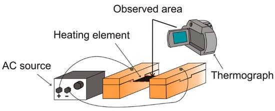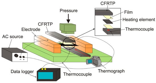 As shown in Figure 4, the temperature history of the heating element itself was measured with a thermograph (R300SR-H, Nippon Avionics Co., Ltd., Tokyo, Japan) when the same output power was applied. During the welding process, the temperature history of the welded zone was measured with a type K thermocouple and a data logger (Portable Multi Logger, Omron Co., Kyoto, Japan) between the CFRTP laminated plate and PA film as shown in Figure 5. The thermograph was also used to measure the temperature history of the welded zone.