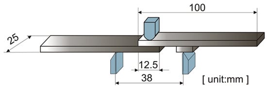 Flexural test was conducted based on JIS (Japan Industrial Standard) K 6856 by using a universal testing machine (5566, Instron Japan Co., Ltd., Kawasaki, Japan) as shown in Figure 6. The span length was 38 mm and the displacement velocity was 1.7 × 10−5 m/s. The flexural strength was obtained by dividing the maximum load by the welding area based on JIS K 6856.