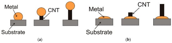 Figure 8. Schematic drawing of growth mechanism of carbon nanotube: (a) pushing up the metal particle; (b) growing up with the metal particles rooted on the surface of the substrate.