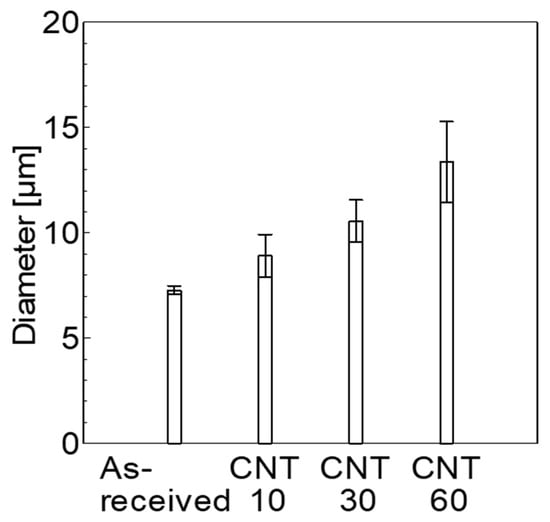 Figure 9. Diameter of As-received, CNT10, CNT30 and CNT60. (N = 5, mean ± S.D.).