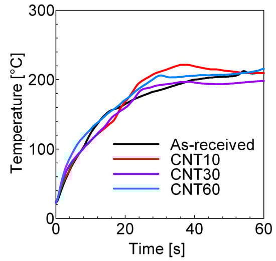 Figure 11 shows the temperature history of the welded zone measured by the type K thermocouple during the welding process. There was no significant difference in the temperature history between As-received, CNT10, CNT30 and CNT60. Figure 12 shows the thermal image of the welded zone measured by the thermograph. No effect of CNT deposition on the temperature history was observed because the generated heat of the heating element transfers to the polyamide film and CFRTP specimens.