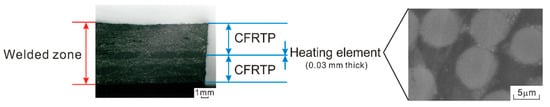 Figure 3 shows the schematic drawing of the experimental setup for resistance welding. Between the two CFRTP specimens, As-received or CNT grafted carbon fibre, as the heating element, is stacked in between two layers of PA films with a welding length of 12.5 mm. For the power supply to the heating element, a high frequency power supply unit (T162-6014AAH, Thamway Co., Ltd., Fuji, Japan) and impedance converter (T010-6012A, Thamway Co., Ltd., Fuji, Japan) were used at the frequency of 20 kHz and the output power of 70 W. After applying the pressure of 2 MPa by using a universal testing machine (AGX-250kN, Shimadzu Co., Ltd., Kyoto, Japan), the energization was applied for 1 min and the welded specimen was air-cooled for 30 s under the pressure of 2 MPa.